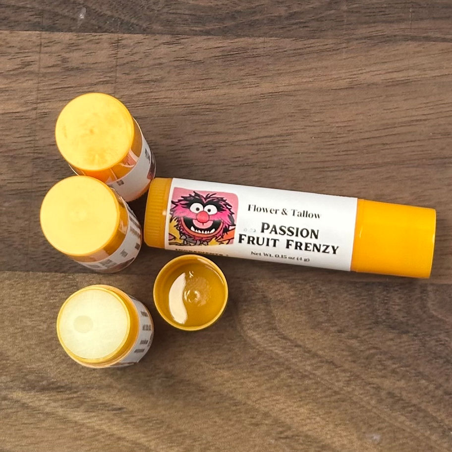 Drum up the frenzy with Passion Fruit Frenzy, capturing Animal's unhinged, powerhouse energy in a balm that's pure wild rhythm. Our standout grass-fed beef tallow, loaded with vitamins A, D, E, and K; delivers intense nourishment and repair, fortifying lips for any beat. Passion fruit extract zings with juicy, chaotic tang, while homemade calendula-infused olive oil soothes the aftermath of the storm. Refined shea butter adds creamy balance, organic beeswax provides a resilient shield, Manuka honey heals the wild ride, and vitamin E ensures vibrant staying power. Capped with a natural passion fruit blend that sparks images of crashing cymbals, manic grins, and unstoppable drive, like Animal's thunderous "WO-MAN!!" and drum-smashing passion. Glide it on for instantly revitalized, plump lips ready to rock. Your ritual turns into an electrifying performance.